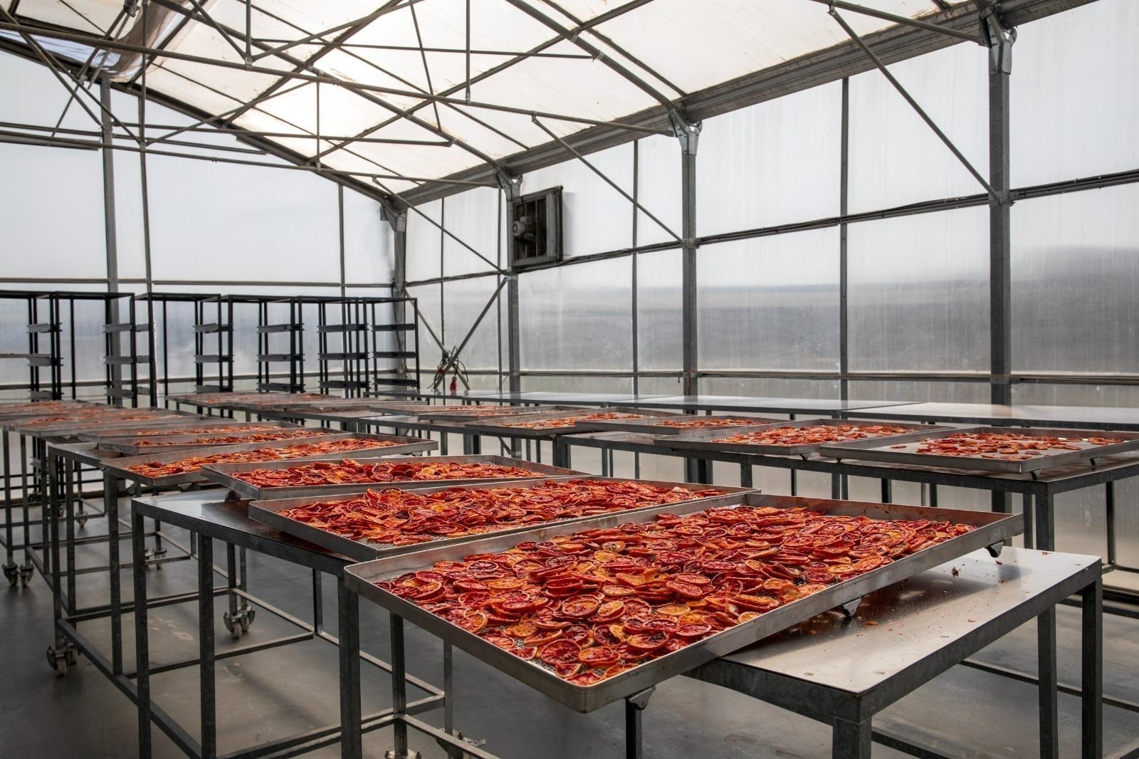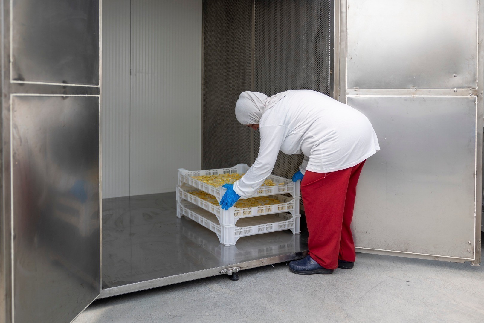 200 m² kapalı sera ortamında, hijyenik koşullarda, doğal güneş ısısı ile meyve ve sebze kurutma işlemi sağlanmaktadır. Ayrıca, güneş panellerinden elde edilen yenilenebilir enerji ile çalışan, ikisi 60 tepsi kapasiteli ve biri 120 tepsi kapasiteli fırınlarımız ile kurutma işlemi yapılmaktadır. Tüm kurutma işlemlerimiz, gıda tüzüğüne uygun şartlarda gerçekleşmektedir.